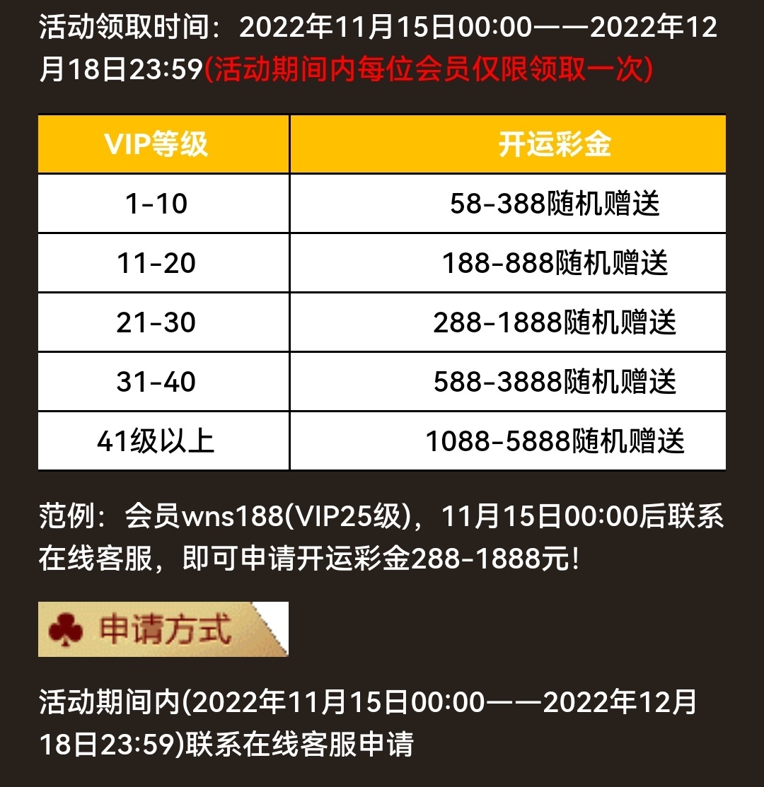 老用户账号有VIP等级1以上联系客服申请最低58彩金
