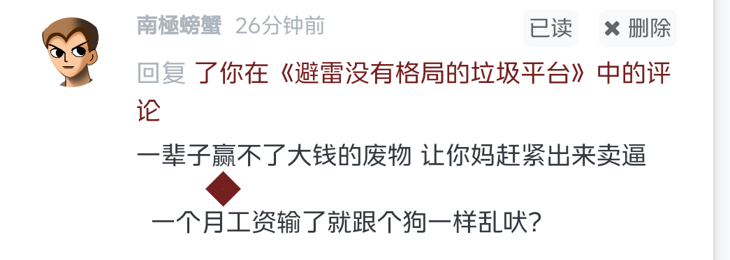 南極螃蟹 劳资就白嫖到200,气死你个狗日的,输死你个逼,拿着你妈妈卖逼赚的5000块输完了,到处喷了是吧。输急眼了?