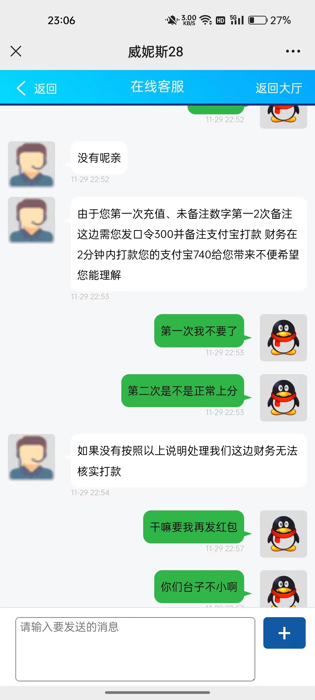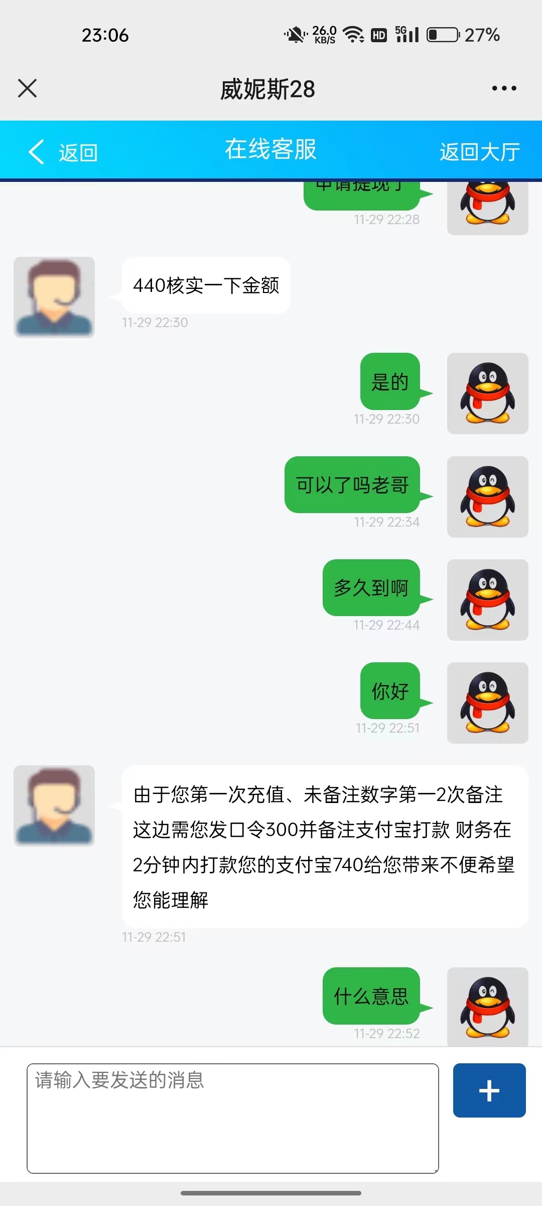 打到100下分一下午一直没到 晚上没事看了看 问了一下客服,说让我充值100到258给我补上去,然后我发口领没有备注,又发了100口领备注了 确实到了258,打完下分440然后给我说这个 一直在跟客服磨,磨到让我再发128口,这不纯傻逼吗