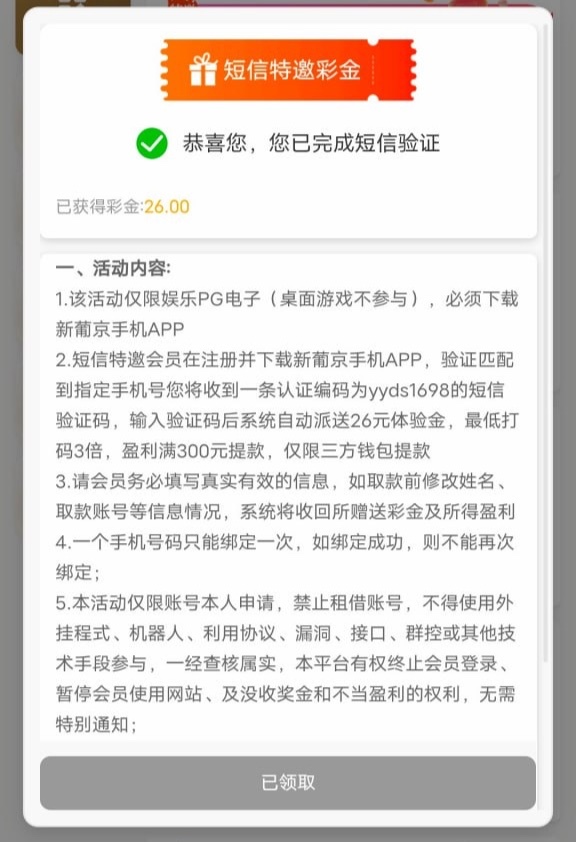 特邀碰瓷,新用户注册活动里面去碰瓷特邀26彩金,可以先看看下方短信有没有,没有可以碰瓷试试吧