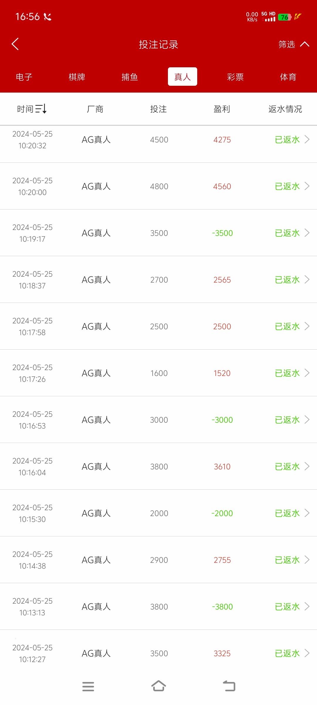 输1.2w 明天充值提现活动能领6k 玩了一个通宵到下午 反反复复充充提提 一个月不到打了136万流水 基本是AG 红了3个多 吐回去1.2个