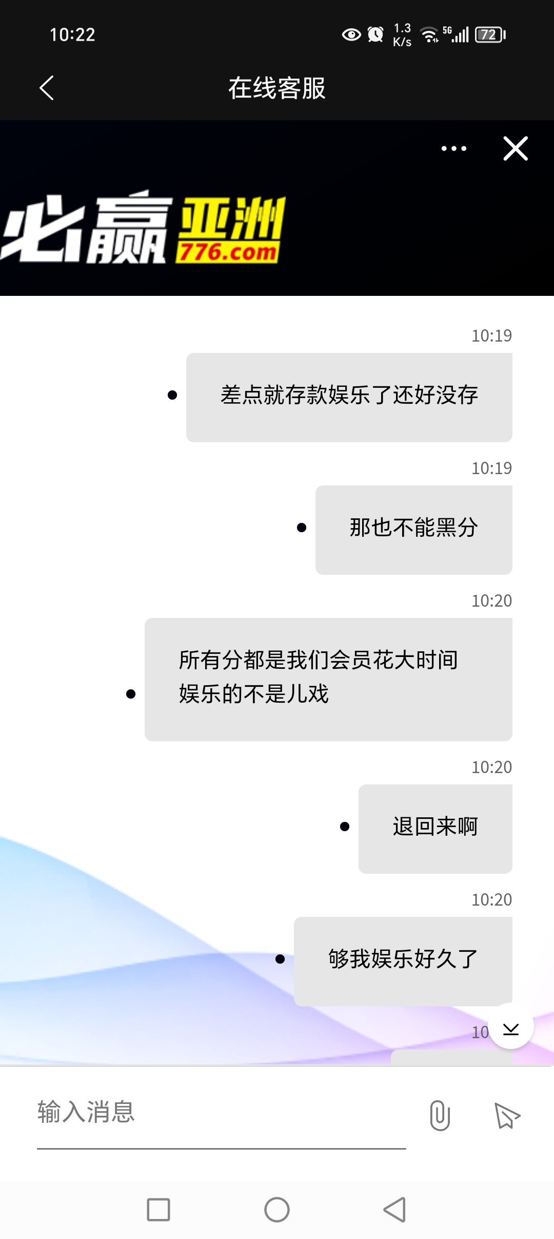 这狗鸡巴平台纯属就是野鸡平台黑台,我也出现过提现不了,还得手持手持手迟了,还没有用,聊天页面退出,又要重新聊天,到了最后又给你加一项支付宝,扫脸录屏,妈的,操,我劝你们别玩这个台子了,真他妈恶心,回复极慢,有这么多人出现,这种现象必定黑你