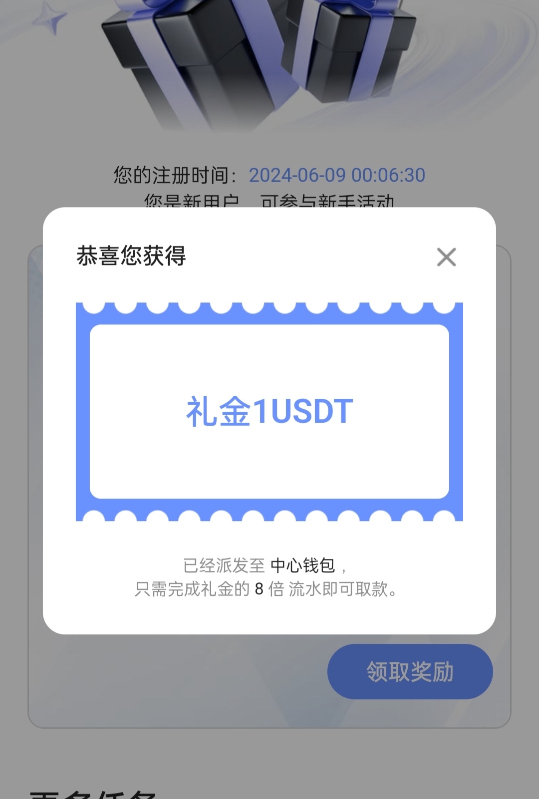 新用户注册去优惠往下滑有个新人任务绑定手机号银行卡秒领1usdt,最低14usdt起提,可以换成RMB玩,具体自测切记勿充值。