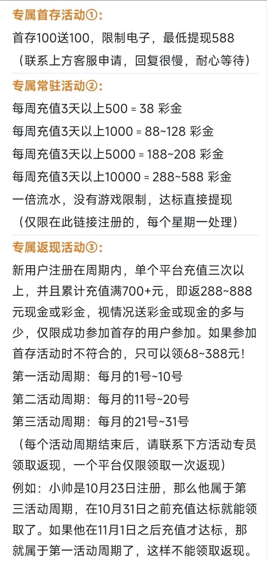 活动:新用户首存100+100(只能娱乐电子游戏,井且满足10倍流水即可无限制提款或者最低提款588元)首存活动只能参加一个参加100+100其他首存活动都无法参与,本活动仅限独立账户参与,如同一姓名、同一手机号、同一IP.同一银行卡账户多账户均不参与,该活动需要在未下注前申请