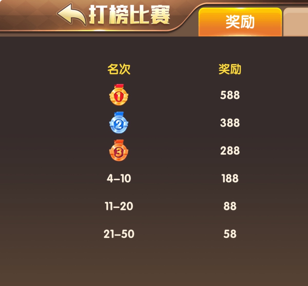 每晚7-8点打榜比赛,得提前报名参赛,否则到点没有比赛资格,前50名都有奖金58-588,上榜的奖励结束后会派发到银行里