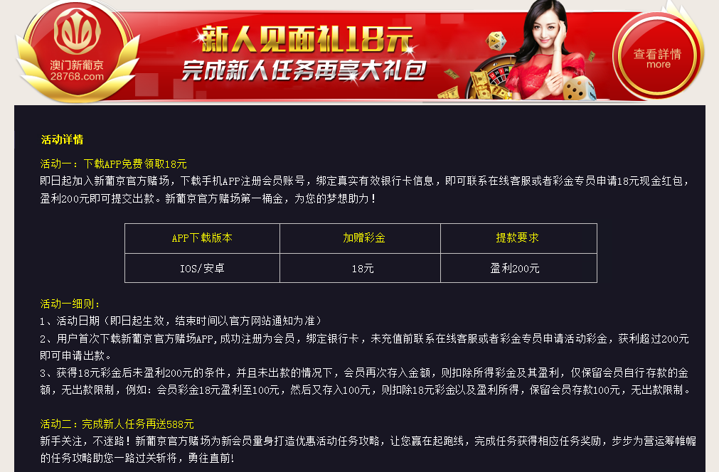 新用户APP注册送18元彩金/满200元提款