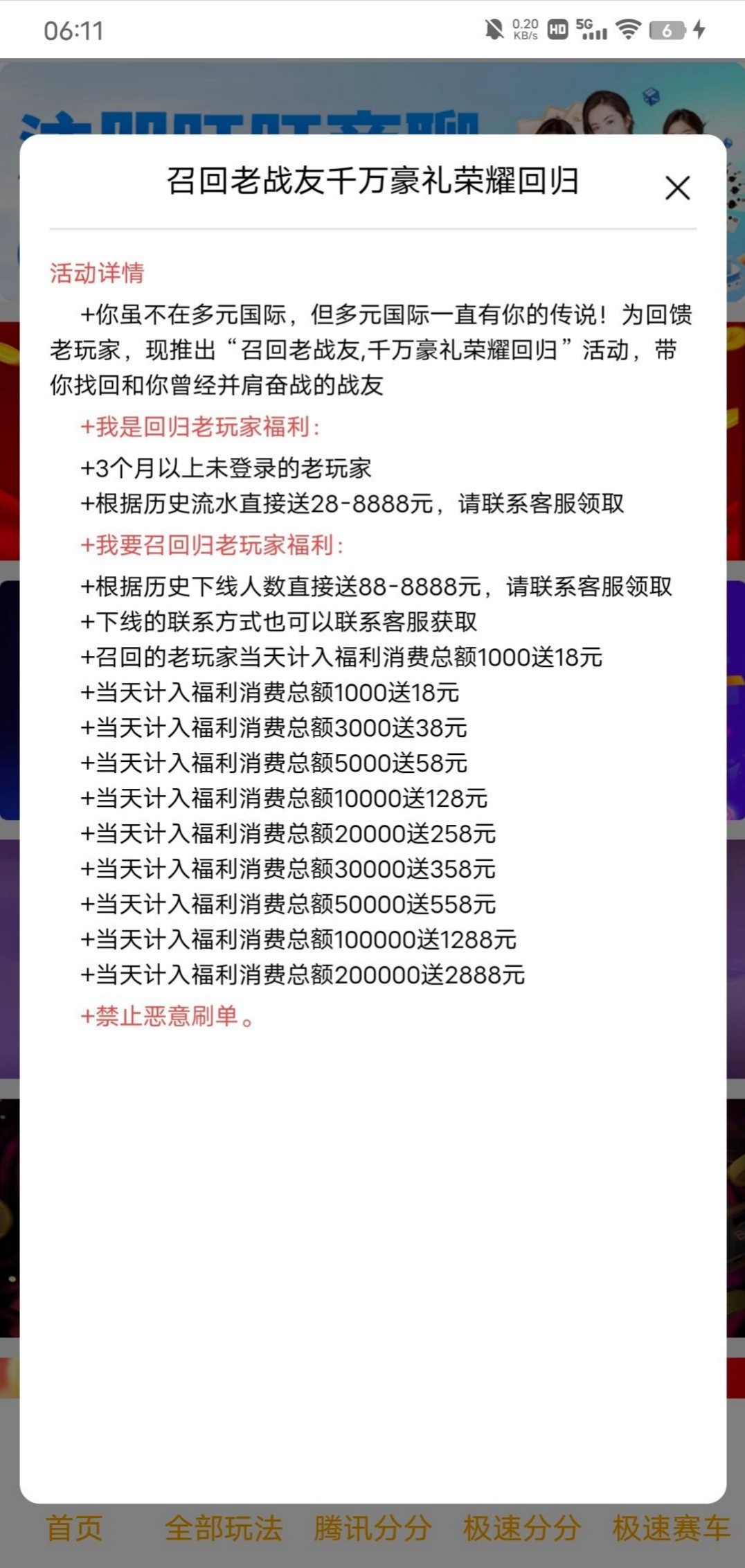 链接dy66a.com,用手机号登录,以前充值玩过的送108,1杯水提,我送了2个号,然后找客服还能申请回馈彩金,送了38挂了。