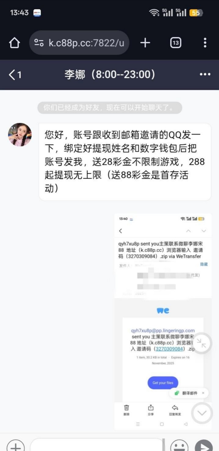 我邮箱收到的,不知叫啥彩票,送了28体验金,我没打出来k.c88p.cc