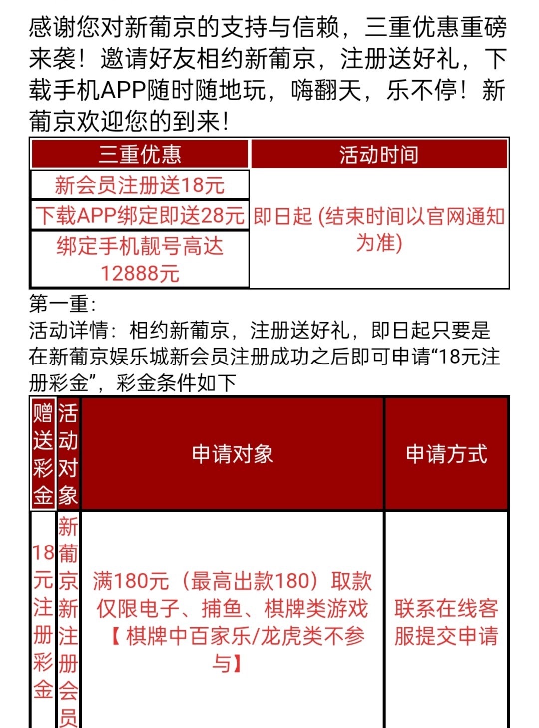 新用户注册完善个人信息绑定绑定银行卡即可联系在线客服申请注册彩金18彩金 下载平台APP再送28彩金 限制 电子 棋牌 捕鱼