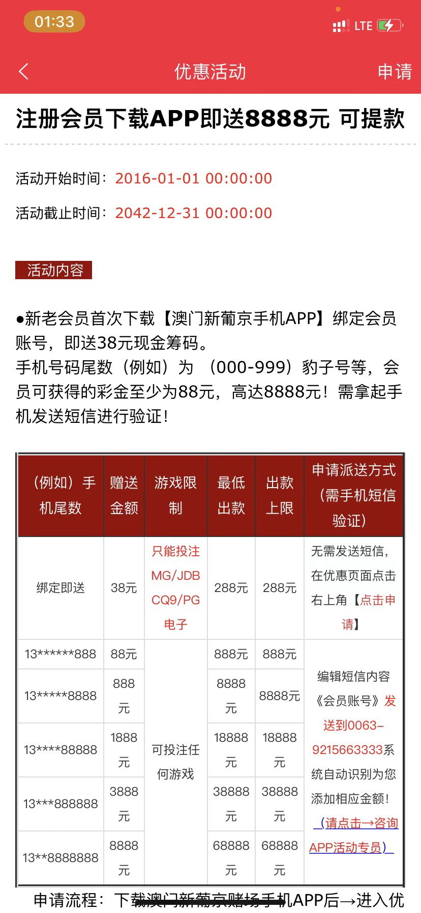 首次下载APP注册点击优惠申请38彩金。最低出款288。具体看下方图片